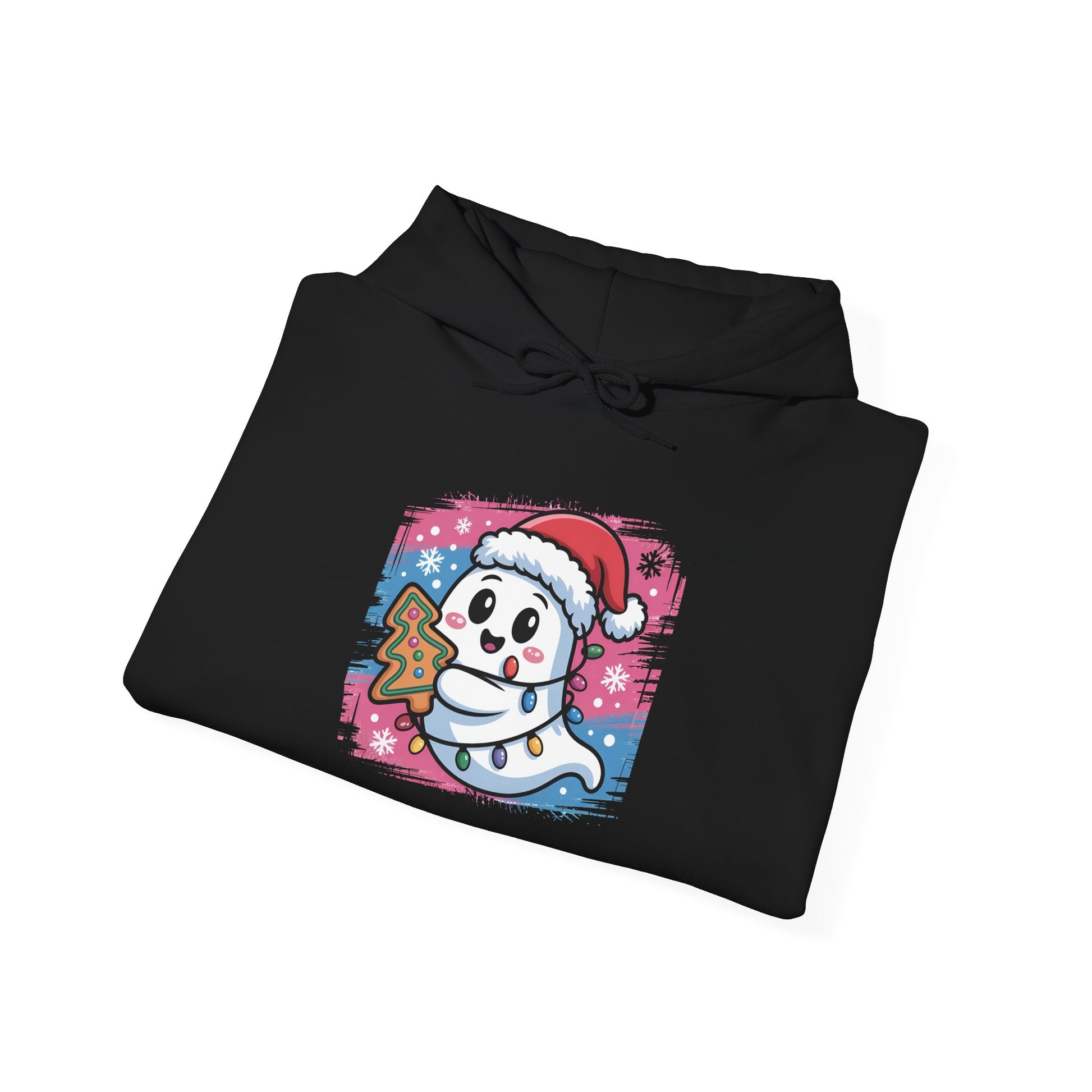 Stay cozy and festive with this hoodie featuring a cute ghost tangled in lights with a Christmas cookie. Perfect for the holiday season, this hoodie has a classic fit, spacious kangaroo pocket, and adjustable drawstring hood for added warmth and comfort. Ideal for adults looking for a fun and unique festive garment.